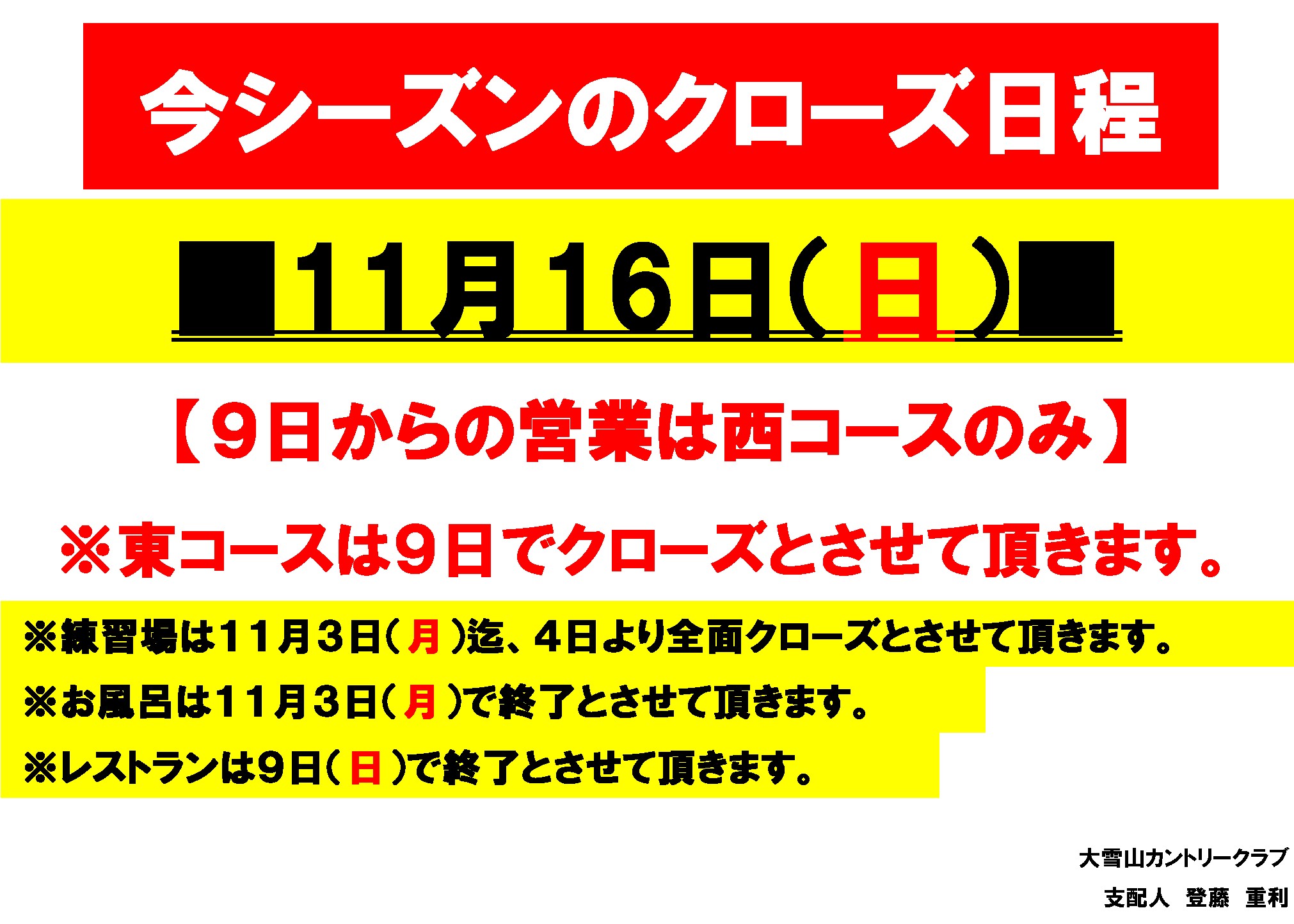 今シーズンのクローズのご案内